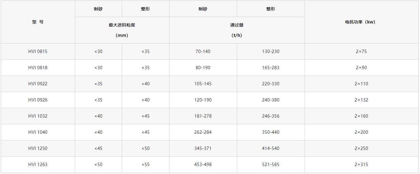 (HVI制砂機技術參數(shù)表)