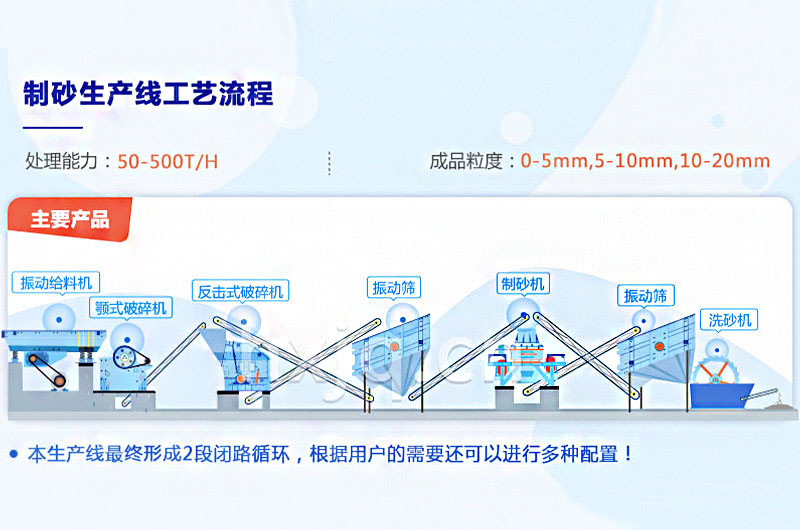 石料由振動(dòng)給料機(jī)送至顎破進(jìn)行粗碎,粗碎后的物料送至圓錐破或反擊破進(jìn)行再次破碎,破碎后的石料通過(guò)輸送機(jī)送進(jìn)振動(dòng)篩進(jìn)行篩分,滿足制砂機(jī)進(jìn)料粒度的石料進(jìn)入制砂機(jī)進(jìn)行制砂,不滿足要求的返回圓錐破或反擊破重新進(jìn)行破碎。從制砂機(jī)出來(lái)的石料,再次進(jìn)入振動(dòng)篩內(nèi)進(jìn)行篩分,篩分出滿足要求的機(jī)制砂,進(jìn)入洗砂機(jī)清洗,清洗后由成品輸送帶輸送即為成品;不滿足要求的砂石混合物料,送入制砂機(jī)進(jìn)行再次破碎。