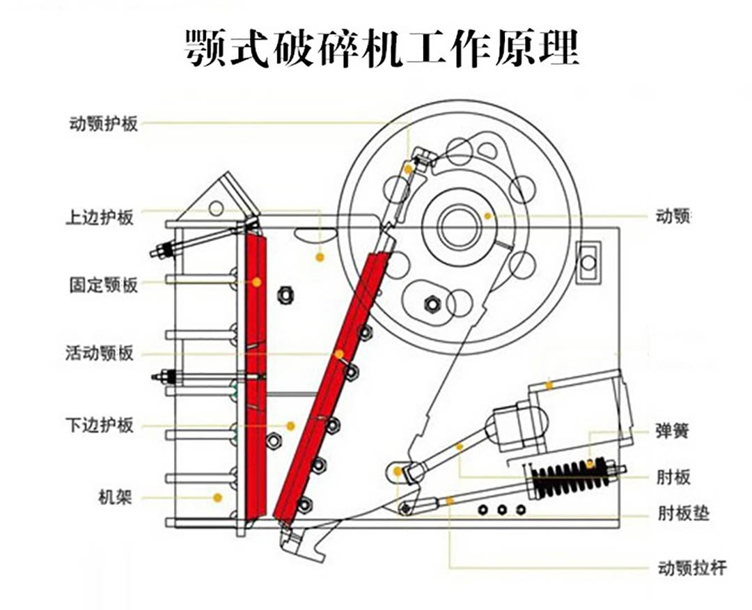 顎式破碎機(jī)由六大部分組成,分別為機(jī)架、傳動(dòng)部分(電機(jī)、飛輪、皮帶輪、偏心軸)、破碎部分(動(dòng)顎、動(dòng)顎板、定顎板)、保險(xiǎn)裝置(肘板、彈簧拉桿部)、調(diào)整部分、潤(rùn)滑裝置。