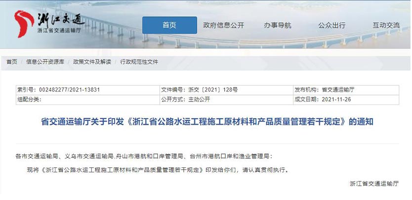 近日,浙江省交通運(yùn)輸廳制定出臺(tái)《浙江省公路水運(yùn)工程施工原材料和產(chǎn)品質(zhì)量管理若干規(guī)定》(以下簡稱《若干規(guī)定》)。